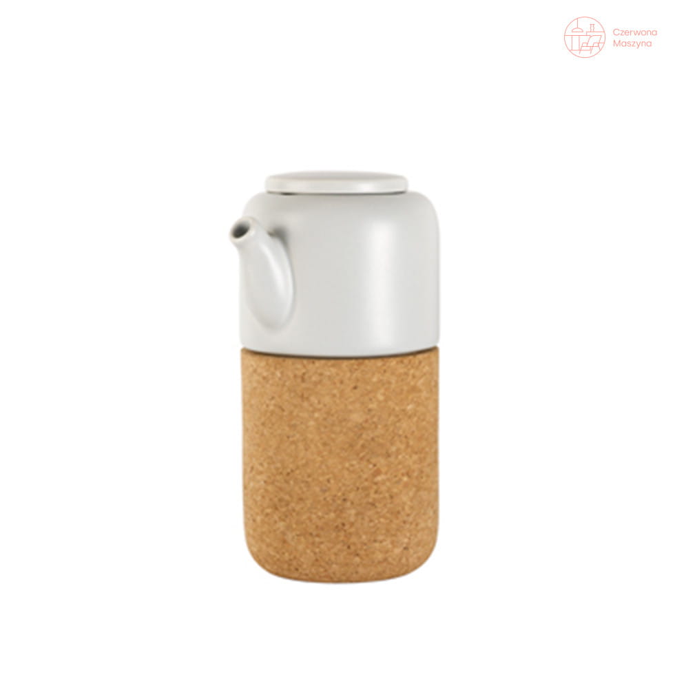 Górna część to biały, ceramiczny dzbanuszek z charakterystycznym dzióbkiem i pokrywką, która sprawia, że parząca się w środku herbata zatrzymuje swoje aromaty wewnątrz naczynia. Dół to cylindryczne przedłużenie dzbanka wykonane z korka – dekoracja na wysokim poziomie!