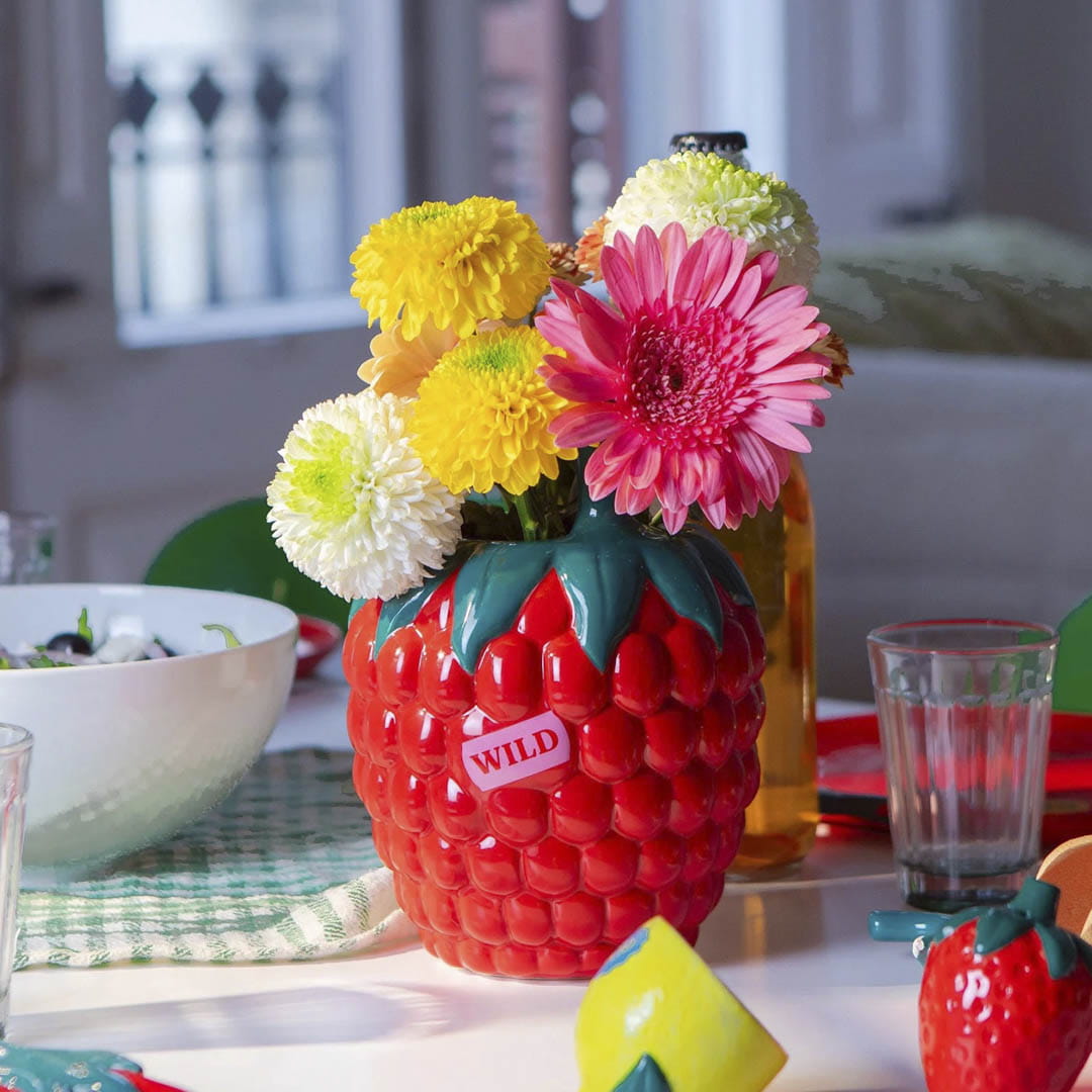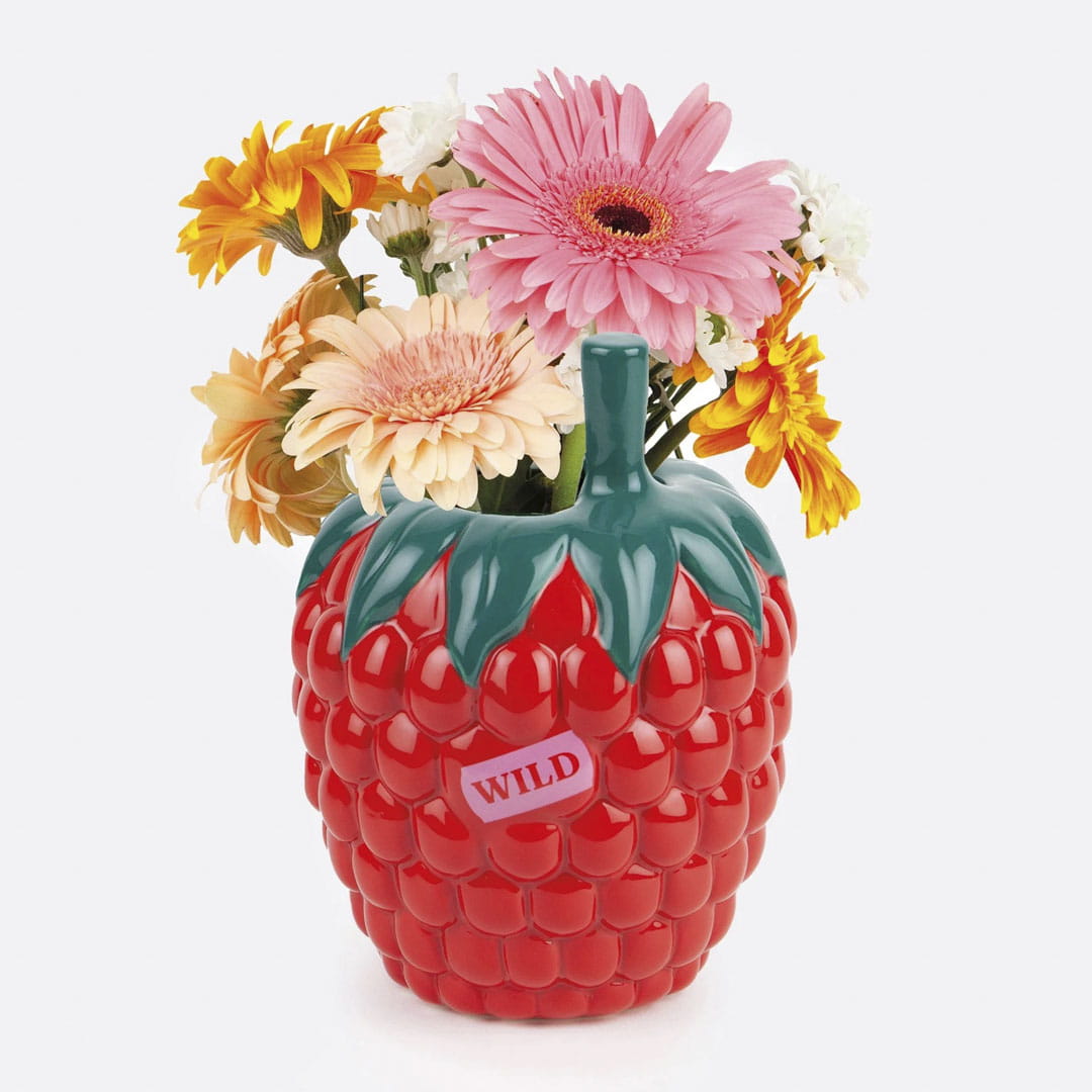 Czerwony ceramiczny wazon w kształcie maliny DOIY Farmers’ Market (DYVASFMRA) to radosny akcent do wnętrz, które nie boją się koloru i odrobiny ekstrawagancji. Zainspirowany wyglądem dojrzałego owocu, zachwyca zabawną formą, głęboką czerwienią i zielonymi detalami przypominającymi liście.
