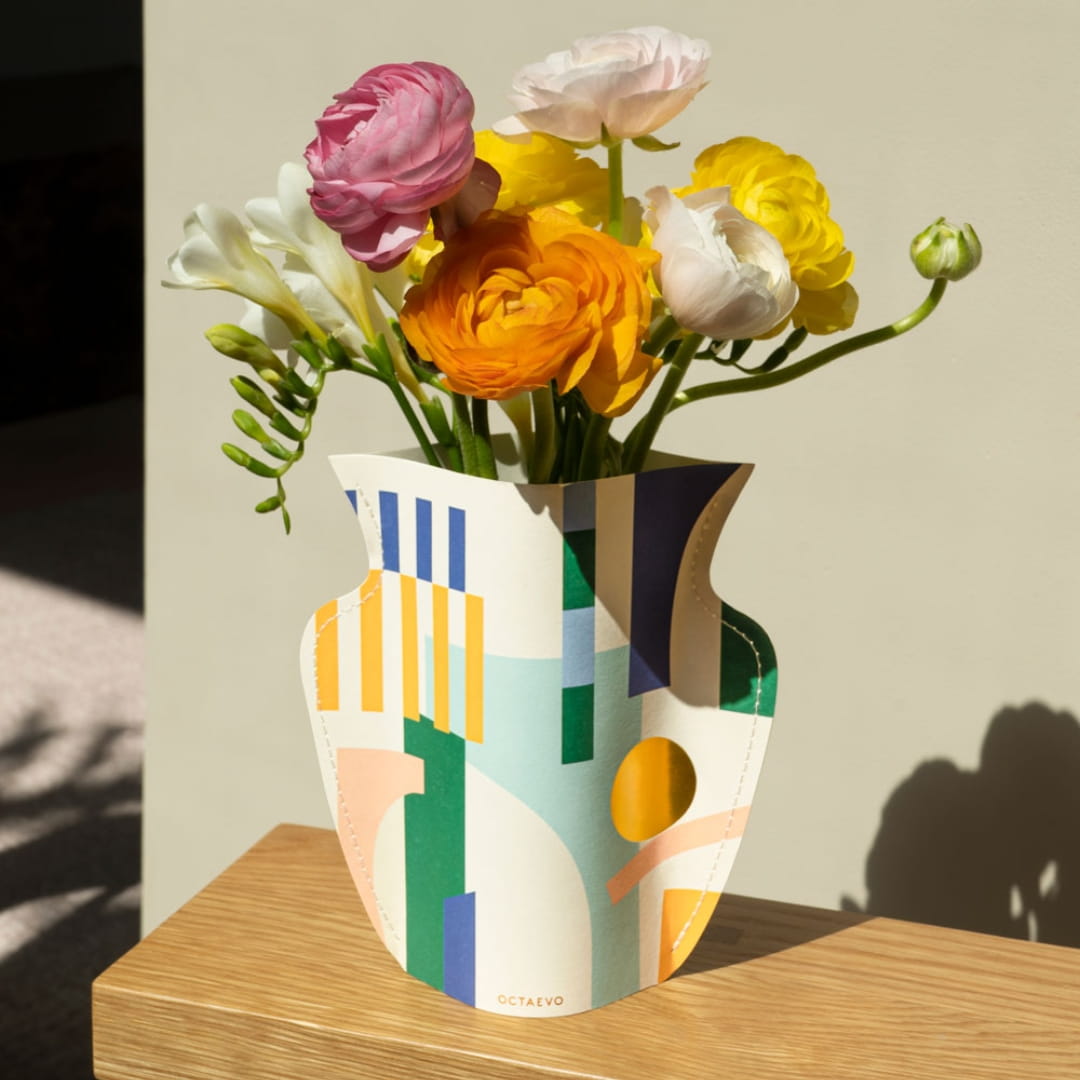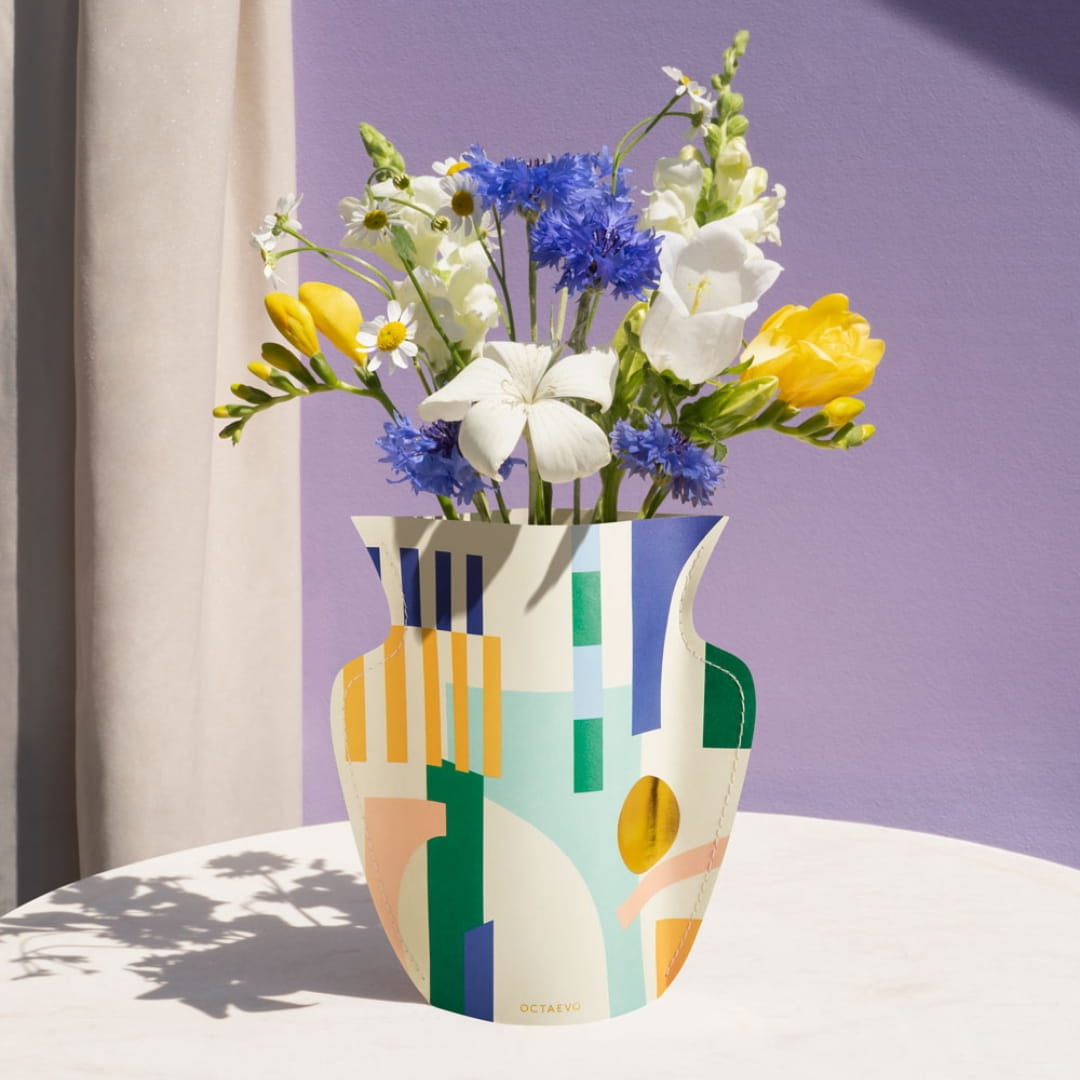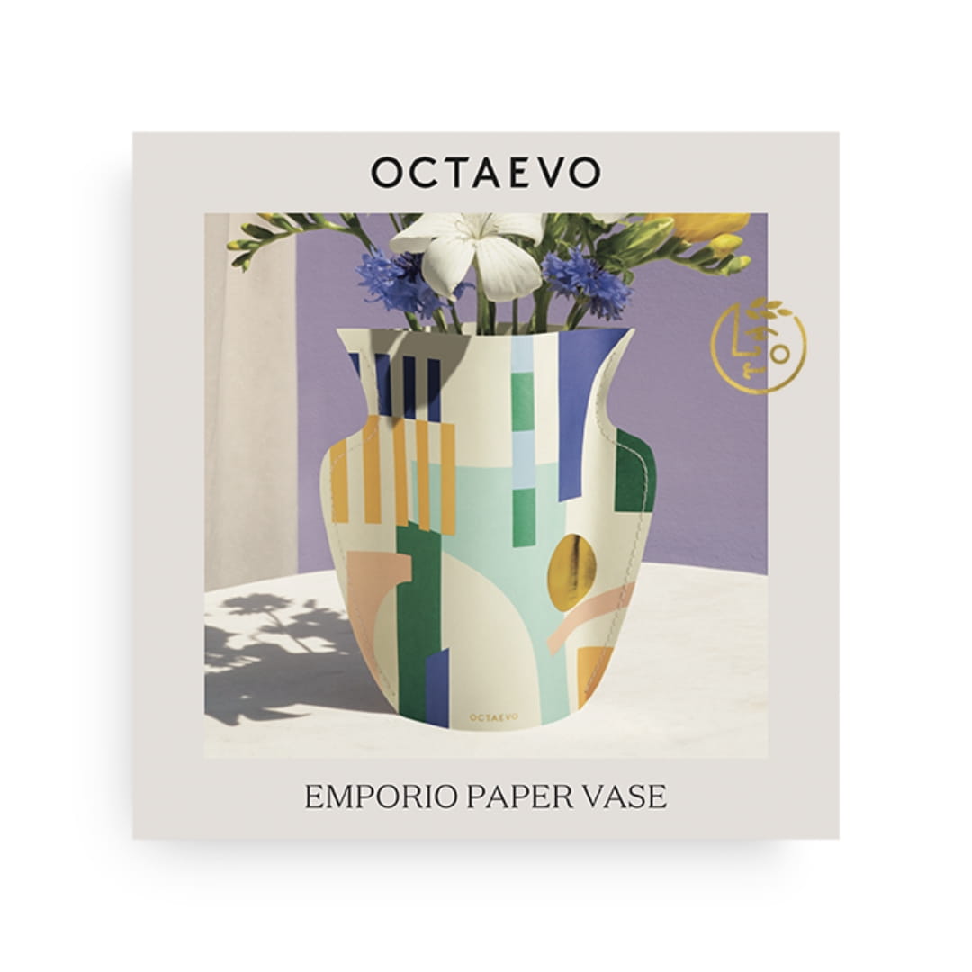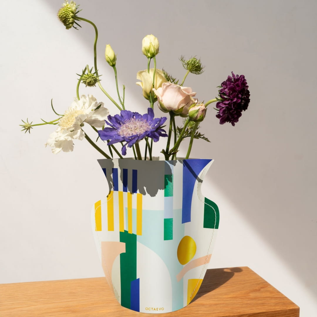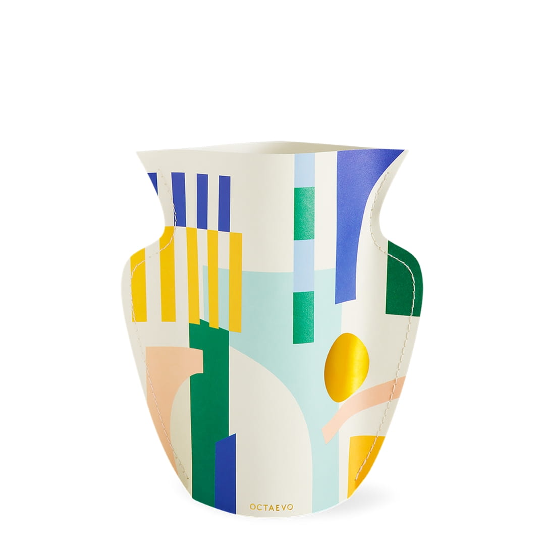 Papierowy wazon Octaevo Emporio Mini to ręcznie wykonany produkt, wyróżniający się unikalnym wzorem. Wykorzystuje wiele kolorów, w tym m.in. żółty, zielony, jasny niebieski czy ciemny niebieski. Całość zdecydowanie zwraca na siebie uwagę!