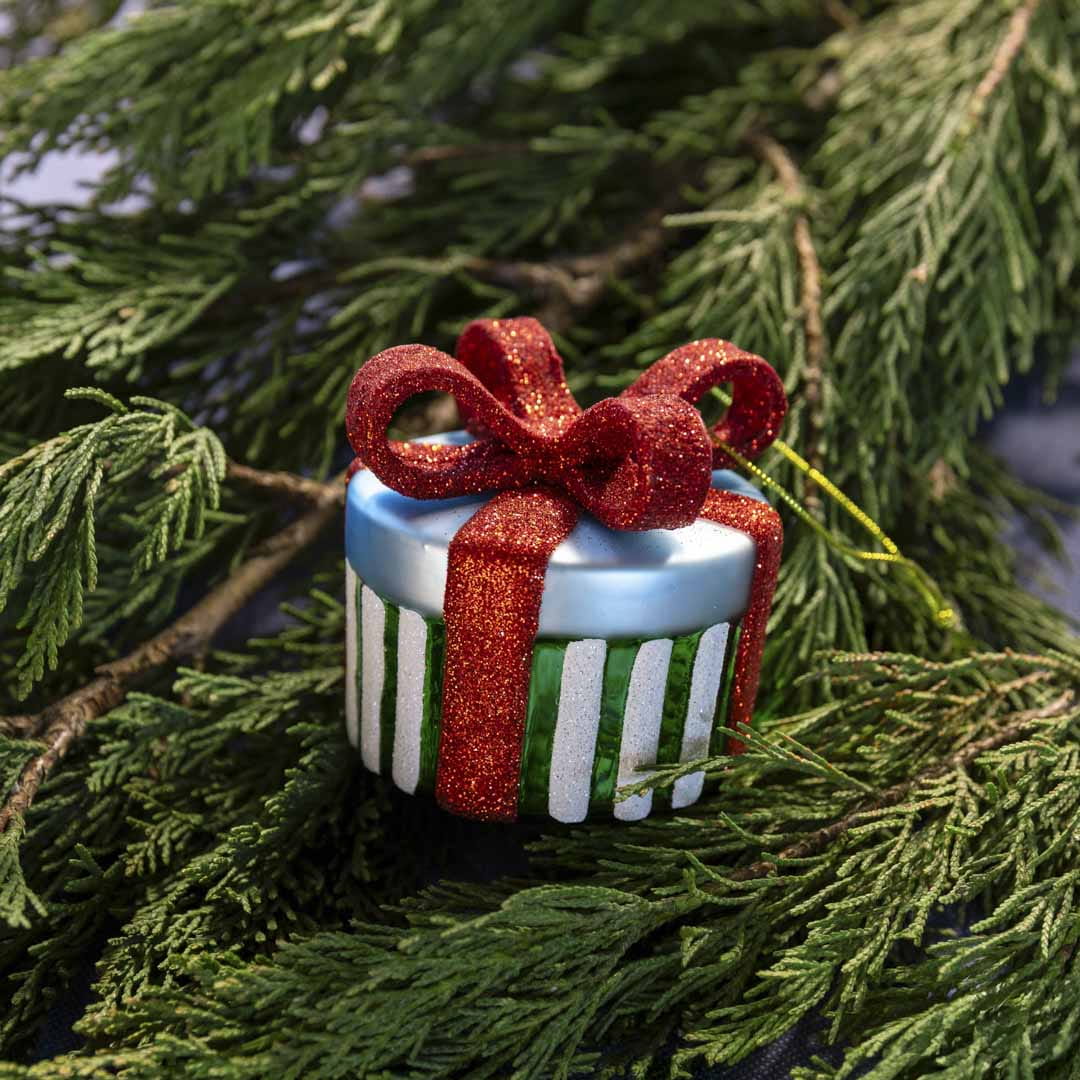 Szklana bombka &k Amsterdam Ornament w kształcie zielonego prezentu z czerwoną kokardą