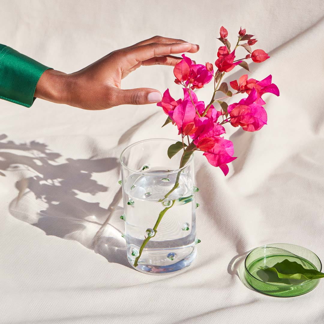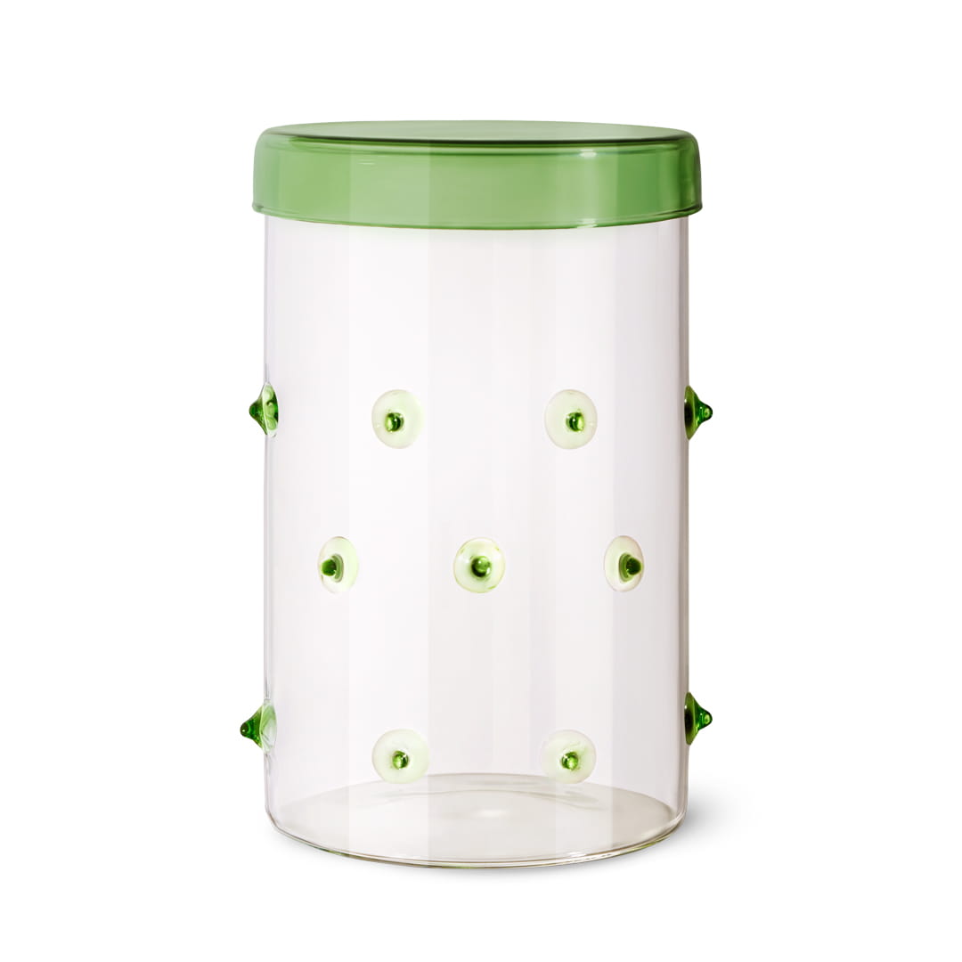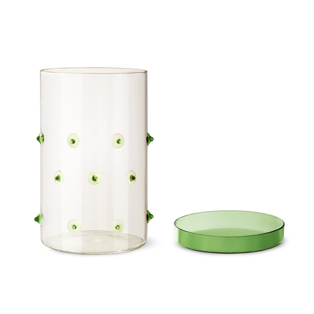 Minimalistyczny, cylindryczny kształt w połączeniu z przezroczystym szkłem i zielonymi detalami doskonale odnajduje się w nowoczesnych wnętrzach. Zielona pokrywka pozwala estetycznie przechować akcesoria biurowe, łazienkowe lub drobne dekoracje.